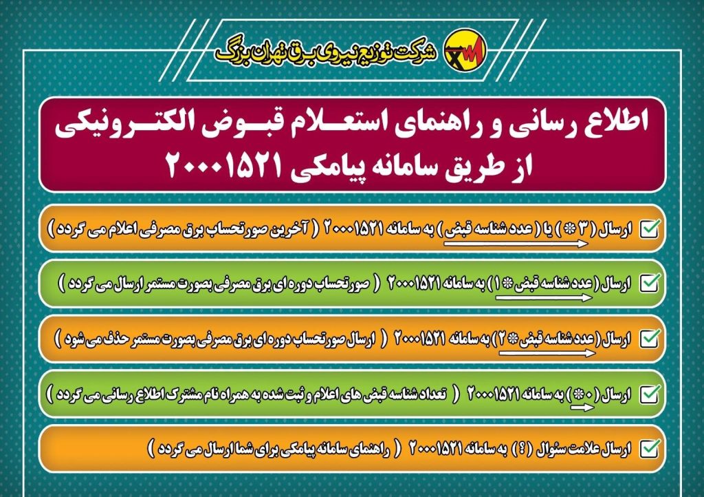 - بعد از دریافت شناسه قبض برق، آن را بدون هیچ فاصلهای با قالب ۱ *شناسه قبض تایپ کرده و برای مشترکان تهران به سرشماره ۱۰۰۰۱۵۲۱ و برای مشترکان سایر استانها به سرشماره ۲۰۰۰۱۵۲۱ ارسال کنید.
